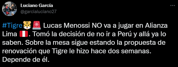 Hay una historia de por medio, la situación se manejó de esta manera, es alucinante cómo se modificó todo este ambiente: “Lucas Menossi NO va a jugar en Alianza Lima. Tomó la decisión de no ir a Perú y allá ya lo saben. Sobre la mesa sigue estando la propuesta de renovación que Tigre le hizo hace dos semanas. Depende de él”.