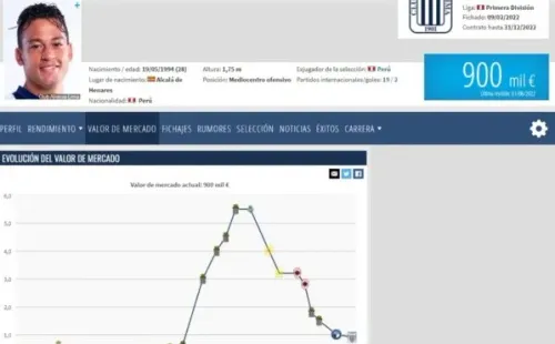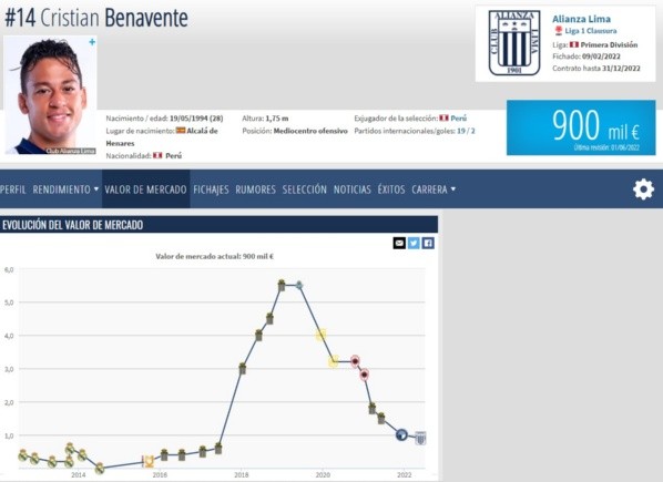 Tomando como base la página de fichajes internacionales Transfermarkt, el mediocampista peruano Cristian Benavente tiene un nuevo precio en el mercado. Tasándolo después de haber jugador el Torneo Apertura con la camiseta de Alianza Lima, el monto sorprende pues significa un descenso considerable en la carrera del ‘Chaval’.