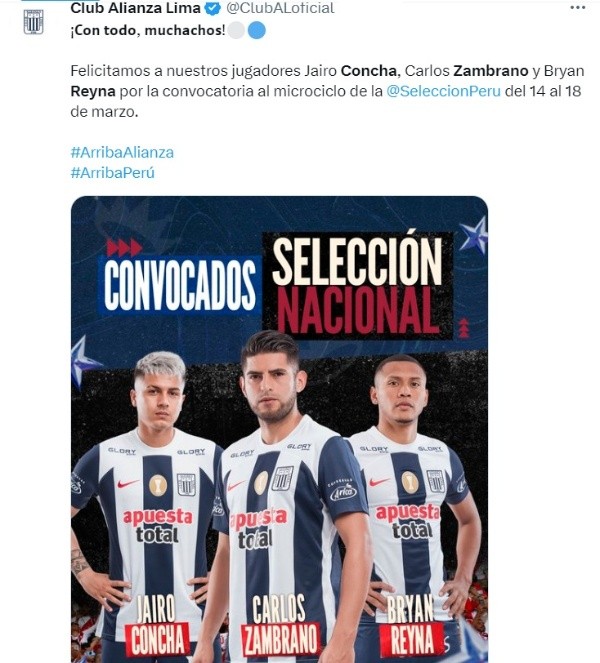 Conscientes que fueron llamados a la Selección Peruana que dirigie el técnico Juan Reynoso, Alianza Lima no contará para este domingo 19 de marzo con tres elementos: el defensor Carlos Zambrano, el mediocampista Jairo Concha y el extremo Bryan Reyna.