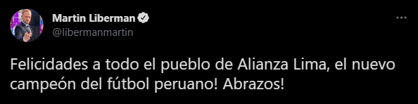 Alianza Lima aparte fue saludado por diversos clubes del torneo local, personajes importantes de la sociedad peruana, entre otros. Pero este mensaje de Liberman, seguramente fue uno de los más considerables, por la trascendencia del relevante comunicador.