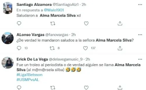 Con este comentario los fans de las trasmisiones del canal comenzaron a reaccionar al darse cuenta de que en ese saludo había un juego de palabras en el nombre ‘Alma Marcela Silva’. Al parecer, el comentarista fue ‘troleado’ por un hincha que quiso jugarle una broma, donde los seguidores se dieron cuenta inmediatamente.