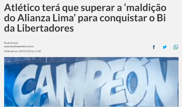 Justamente este diario del país de la zamba, publicó un informe, lo cual causó mucha polémica. Este portal indicó que si Atlético Mineiro quiere lograr su segunda Copa Libertadores, deberá superar una Maldición que recae en la escuadra victoriana. “Atlético tendrá que superar La Maldición de Alianza Lima para conquistar la Libertadores”, se lee en el titular.