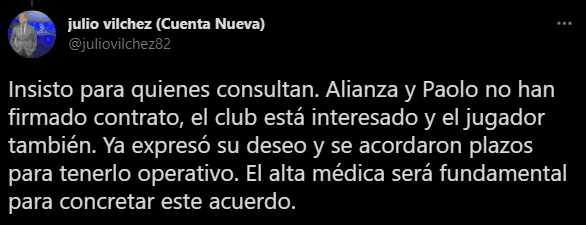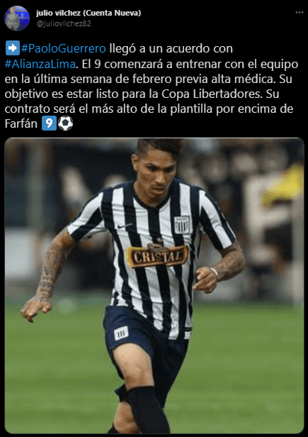 “Paolo Guerrero llegó a un acuerdo con Alianza Lima. El 9 comenzará a entrenar con el equipo en la última semana de febrero previa alta médica. Su objetivo es estar listo para la Copa Libertadores. Su contrato será el más alto de la plantilla por encima de Farfán”. Comentó en su cuenta de Twitter el periodista Julio Vílchez.