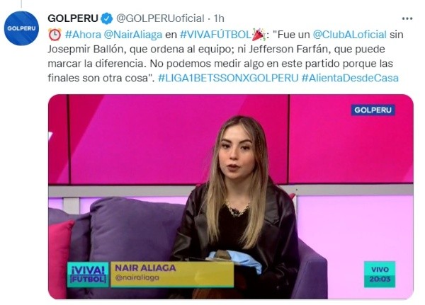 Tras las ausencias en el cuadro ‘íntimo’, Nair Aliaga, conductora del programa ‘Viva Fútbol’ dijo: “Fue un Alianza Lima sin Josepmir Ballón, que ordena el equipo; ni Jefferson Farfán, que puede marcar la diferencia. No podemos medir algo en este partido porque las finales son otra cosa”, agregó la periodista deportiva.