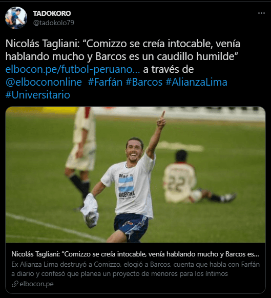 Cuando dispara es porque hay motivos, y si lo hace genera alto revuelo. Nicolás Tagliani estuvo atento al duelo entre su Alianza Lima y Universitario de Deportes, ‘El Loco’ vivió este cotejo como un hincha más. Por ese motivo, tiene razones para disparar a su estilo, pegando contra los hinchas del cuadro ‘merengue’.
