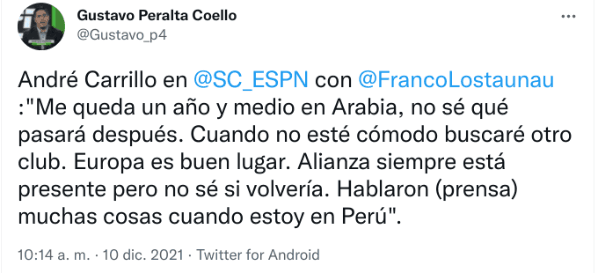 “Me queda un año y medio en Arabia, no sé qué pasará después. Cuando no esté cómodo buscaré otro club. Europa es buen lugar. Alianza siempre está presente pero no sé si volvería. Hablaron (prensa) muchas cosas cuando estuveen Perú”, respondió la Culebra. ¡Clarito!