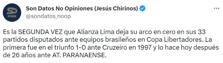 “ALIANZA LIMA HA SUMADO PUNTOS ANTE UN EQUIPO BRASILEÑO EN COPA LIBERTADORES DESPUÉS DE 26 AÑOS. Solo ha puntuado en tres ocasiones en sus 33 partidos disputados ante clubes de Brasil en esta competición: ante Guaraní (1988), ante Cruzeiro (1997) y ante AT. PARANAENSE (2023)”, publicaron.