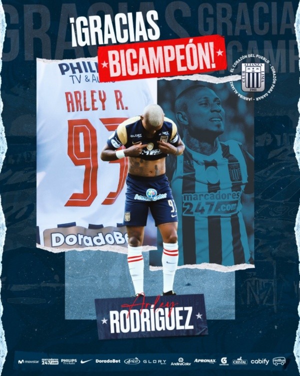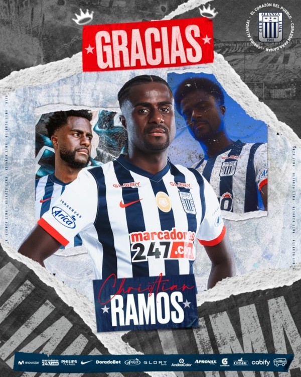 “¡Gracias por toda tu entrega, bicampeón! Te deseamos lo mejor siempre”, despidió Alianza Lima al colombiano Arley Rodriguez, mientras que con Christian Ramos utilizó el siguiente mensaje: “¡Gracias por tu esfuerzo y profesionalismo, campeón! ¡Muchos éxitos en tus próximos proyectos!”, apuntó.