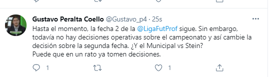 Minutos más tarde, Gustavo Peralta de Líbero dio otra infromación: “Hasta el momento, la fecha 2 de la Liga 1sigue. Sin embargo, todavía no hay decisiones operativas sobre el campeonato y así cambie la decisión sobre la segunda fecha. ¿Y el Municipal vs Stein? Puede que en un rato ya tomen decisiones”.