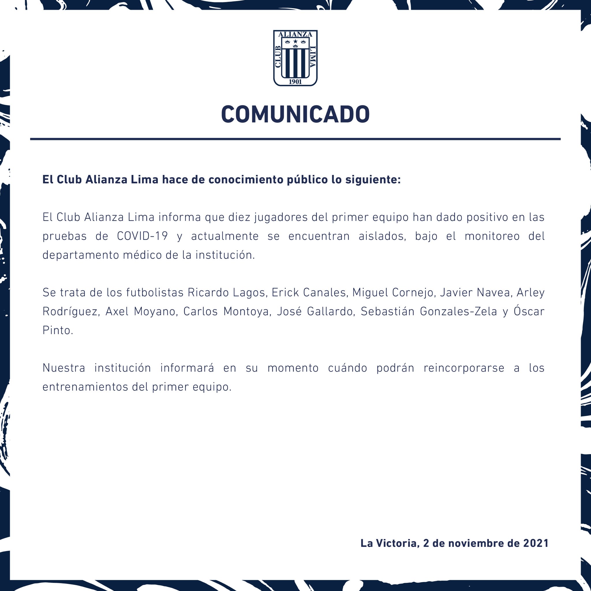 “El Club Alianza Lima informa que diez jugadores del primer equipo han dado positivo en las pruebas de COVID-19 y actualmente se encuentran aislados, bajo el monitoreo del departamento médico de la institución. Nuestra institución informará en su momento cuándo podrán reincorporarse a los entrenamientos del primer equipo”, informó el club.