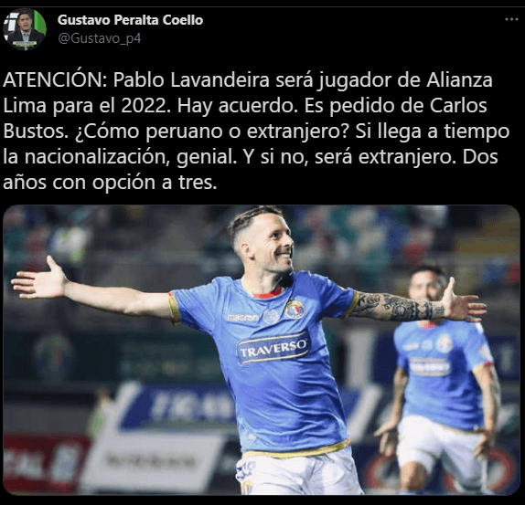 “ATENCIÓN: Pablo Lavandeira será jugador de Alianza Lima para el 2022. Hay acuerdo. Es pedido de Carlos Bustos. ¿Cómo peruano o extranjero? Si llega a tiempo la nacionalización, genial. Y si no, será extranjero. Dos años con opción a tres”. Dicho esto, todo se incendió en la red social del ‘pajarito’.