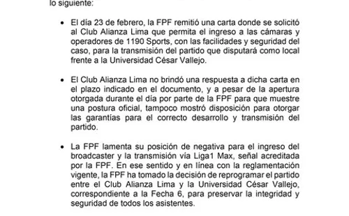 Este último, estaba pactado para el sábado 25 de febrero a las 20:00 hrs. (hora peruana) en el estadio de Matute y la Federación Peruana de Fútbol decidió reprogramar este encuentro, debido a la falta de garantías para el ingreso de las cámaras de 1190 Sports. Todo esto se hizo conocer mediante un comunicado mostrado por suscuentas oficiales.