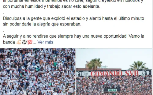 “Disculpas a la gente que explotó el estadio y alentó hasta el último minuto sin poder darle la alegría que esperaban. A seguir y a no rendirse, que siempre hay una nueva oportunidad. ¡Vamos, la banda!”, finaliza el mensaje de disculpas dePablo Míguez.