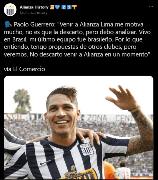 Sin embargo, dentro de esta conversación con el medio escrito, afirmó que le hace ilusión jugar con su compadre, Jefferson Farfán: “Venir a Alianza me motiva mucho la verdad, no es que la descarto, pero lo tengo que analizar”. Para después explicar su situación contractual.