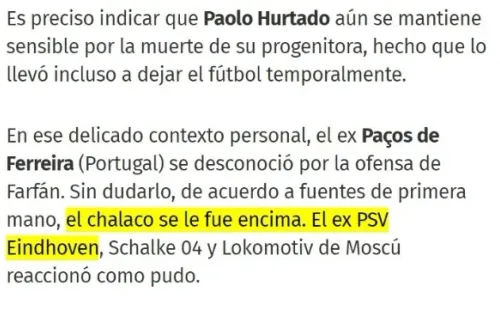 Estando los dos en un salón, la ‘Foquita’ esperaba adentro y cuando vio al ‘Caballito’ le lanzó una frase de grueso calibre que no ha sido revelado. En ese momento Paolo Hurtado, y todavía dolido por el fallecimiento de su madre, se le fue encima a Jefferson Farfán y el “10” de la calle se “defendió como pudo”, comentó el diario Trome.