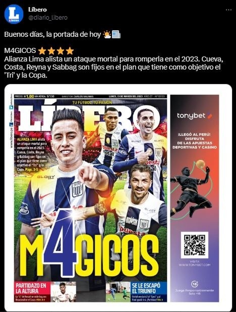 El Diario Líbero hoy abrió su portada con ese detalle, generando opiniones divididas dentro de sus fieles seguidores: “Buenos días, la portada de hoy. M4GICOS. Alianza Lima alista un ataque mortal para romperla en el 2023. Cueva, Costa, Reyna y Sabbag son fijos en el plan que tiene como objetivo el ‘Tri’ y la Copa”.