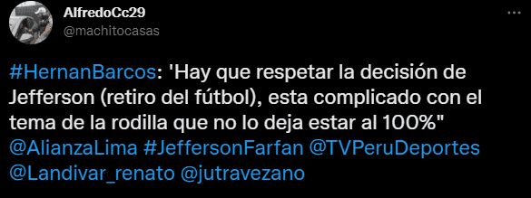 El Pirata habló en exclusiva para el medio de comunicación del estado peruano, con esta afirmación, confirmando la noticia de Radio Programas del Perú, al parecer: “Hay que respetar la decisión de Jefferson (retiro del fútbol), está complicado con el tema de la rodilla que no lo deja estar al 100”