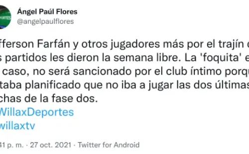 En Alianza, obviamente, tampoco quierensancionarlo. La justificación sería por unacuestión técnica de la burbuja. Ángel Paul Flores dio una versión: “Jefferson Farfán y otros jugadores más por el trajín de los partidos les dieron la semana libre. La ‘foquita’ en su caso, no será sancionado por el club íntimo porque estaba planificado que no iba a jugar las dos últimas fechas de la fase dos”.