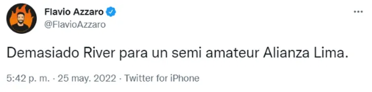 El comunicador no dudó en pronunciarse en su cuenta de Twitter, sobre elpoco juego que mostró el equipo peruano, afirmando que la escuadra deMarcelo Gallardoes mucho para un ‘club semi amateur’ como el cuadro ‘grone’.“Demasiado River Plate para un semi amateur como Alianza Lima”, fue el polémico tuit del argentino.