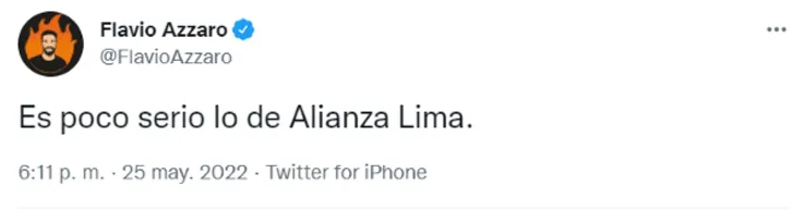 Luego, Flavio Azzaro, volvió a arremeter contra la institución victoriana, resaltando que lo mostrado en el estadio Monumental de Buenos Aires fue paupérrimo y nada serio para un equipo profesional.“Es poco serio lo de Alianza Lima”,señaló en una nueva publicación en su red social.