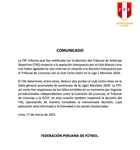 La noticia deportiva en Perú inició a las 5 de mañana, cuando se conoció queAlianza Limasería repuesto a laLiga 1, luego que el TAS fallara a favor del equipo íntimo, indicando que Carlos Stein debe perder 2 puntos por faltas administrativas.