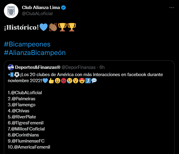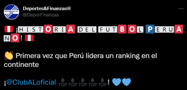 Reescribiéndolo después con una afirmación al respecto, donde los especialistas en esta medición por internet detallan: “Primera vez que Perú lidera un ranking en el continente. Club Alianza Lima”. Motivo de orgullo para sus millones de hinchas, quienes lo han hecho posible una vez más, generar notoriedad a nivel mundial.