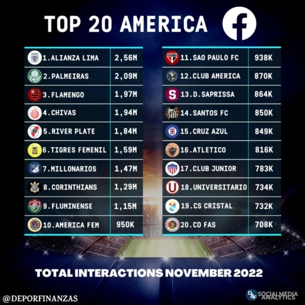 Vamos al grano, la reconocida cuenta de Twitter, Deportes&Finanzas, realizó una publicación con la siguiente descripción: “¡Los 20 clubes de América con más interacciones en Facebook durante noviembre 2022!”. Este listado está liderado por el cuadro Blanquiazul, por un porcentaje alto.