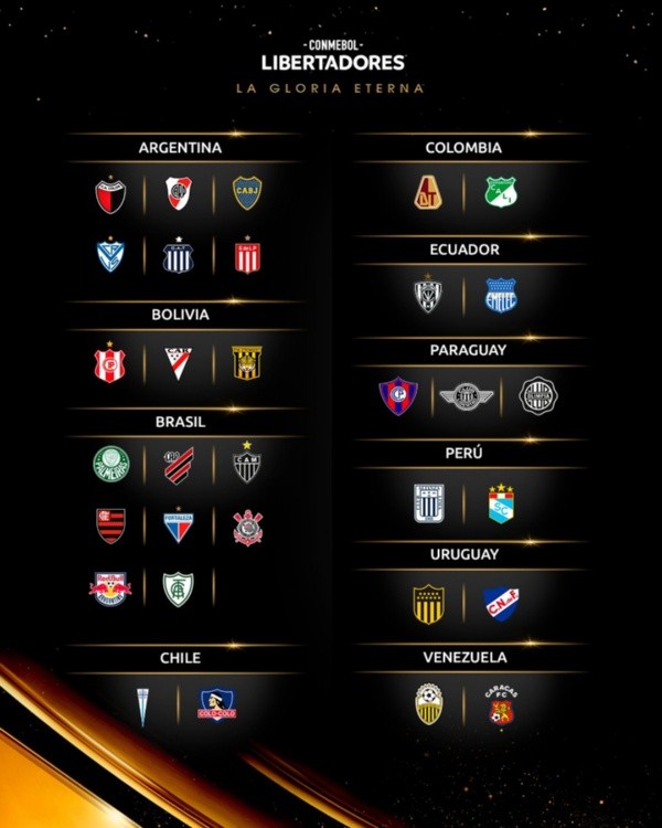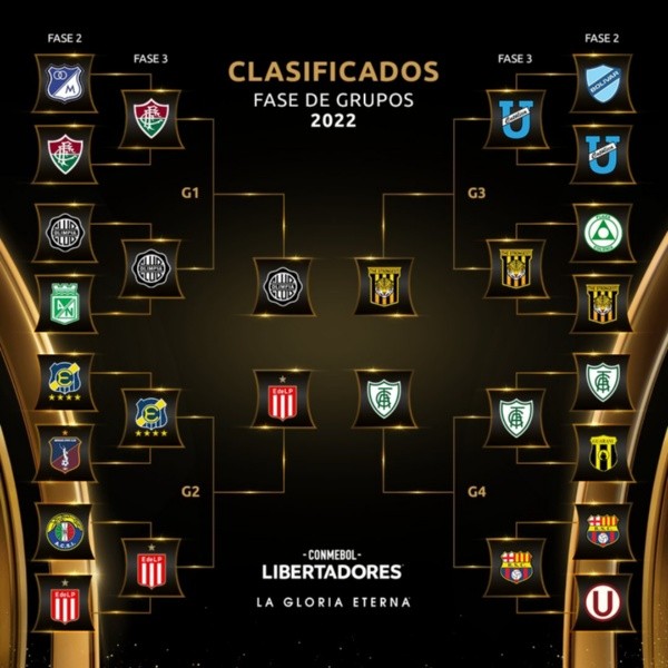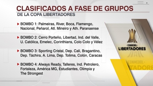 En ese sentiedo, los últimos 4 equipos que han ingresado a los bombos de la Copa Libertadores son Olimpia de Paraguay, América Mineiro de Brasil, Estudiantes de La Plata de Argentina y The Srtongest de Bolivia. Estos cuadros han luchado en las fases previas del torneo continental para llegar hasta las instancias en la fase de grupos, los que aún no se han conformado. Cabe recalcar que estos clubes son los únicos que pueden compartir grupo con un equipo de su mismo país.