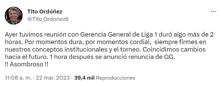“Ayer tuvimos reunión con Gerencia General de Liga 1 2023 duró algo más de 2 horas. Por momentos dura, por momentos cordial, siempre firmes en nuestros conceptos institucionales y el torneo.Coincidimos cambios hacia el futuro. 1 hora después se anunció renuncia de GG. ¡Asombroso!”, mencionó Tito Ordoñezen su tuit.