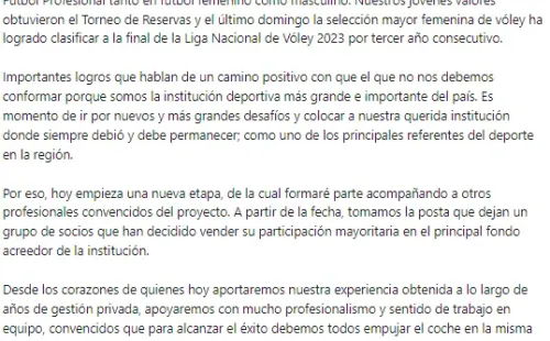 “El 2022 fue un año importante para Alianza Lima. Logramos el Bicampeonato Nacional de Fútbol Profesional tanto en fútbol femenino como masculino. Nuestros jóvenes valores obtuvieron el Torneo de Reservas y el último domingo la selección mayor femenina de vóley ha logrado clasificar a la final de la Liga Nacional de Vóley 2023por tercer año consecutivo”, comunicó.