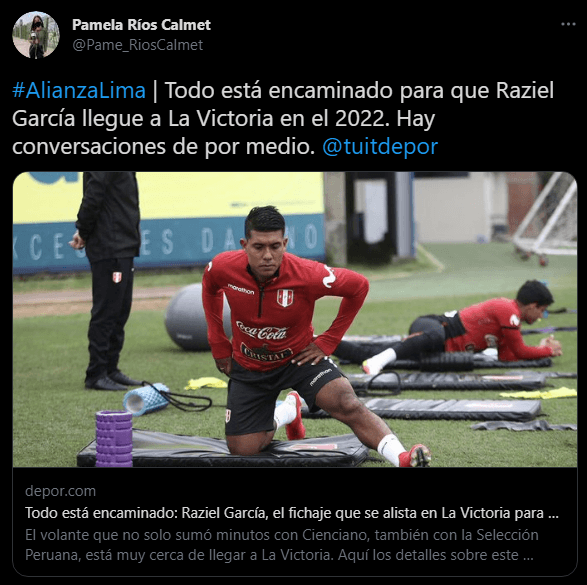 La periodista también en ESPN Perú, Pamela Ríos, es quien destacó la situación de Raziel García. Contando cronológicamente como se gestó este movimiento. Habrá que ver cómo se desarrolla el fondo de la información. Pero todos admiramos al volante, ‘coqueteando’ con los jugadores campeones 2021.