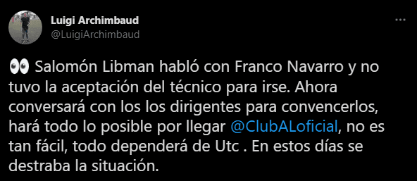 Así lo cuenta el conductor de ‘La Hora de Lalo’: “Salomón Libman habló con Franco Navarro y no tuvo la aceptación del técnico para irse. Ahora conversará con los dirigentes para convencerlos, hará todo lo posible por llegar a Alianza Lima, no es tan fácil, todo dependerá de UTC. En estos días se destraba la situación”.