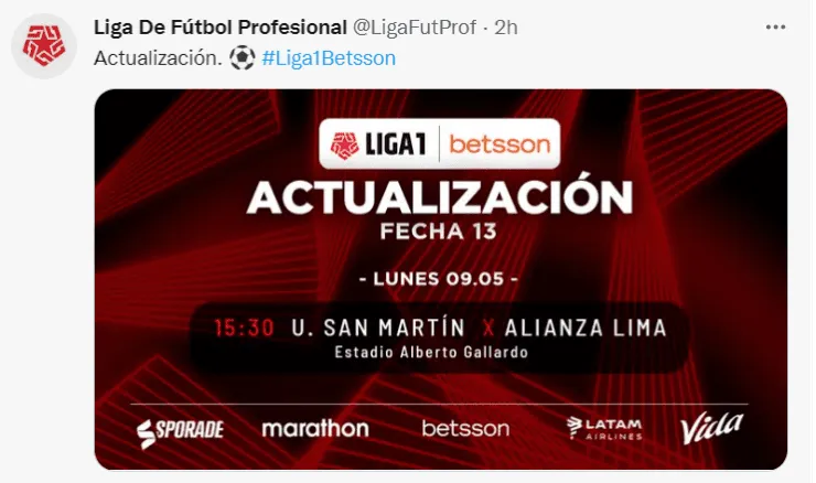 A través de sus redes sociales, la Liga 1, confirmó el cambio de escenario para el duelo del próximo lunes entre la Universidad San Martín y Alianza Lima, por la jornada 13 del Torneo Apertura. El cotejoinicialmente estaba pactado para el Iván Elías Moreno de Villa el Salvador, pero finalmente cambió de sede y se disputará en el Estadio Alberto Gallardo.