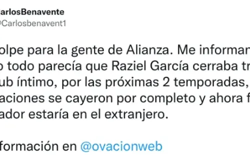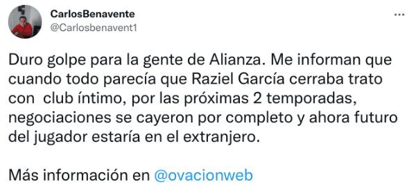 “Me informan que cuando todo parecía que Raziel García cerraba trato con club íntimo, por las próximas 2 temporadas, negociaciones se cayeron por completo y ahora futuro del jugador estaría en el extranjero”, señaló por ejemplo Carlos Benavente de Ovación.