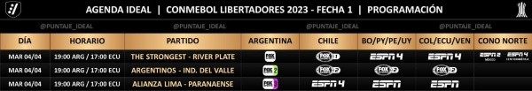 De esta forma, se pudo conocer que el duelo entre Alianza Lima yAthletico Paranaensepor la Copa Libertadores se emitirá para los países de Bolivia, Paraguay, Perú y Uruguay en ESPN. También hay que apuntar que la transmisión será por ESPN para Colombia, Ecuador y Venezuela; mientras que para Chile irá por ESPN 4 y en Argentina por FOX Sports 3.