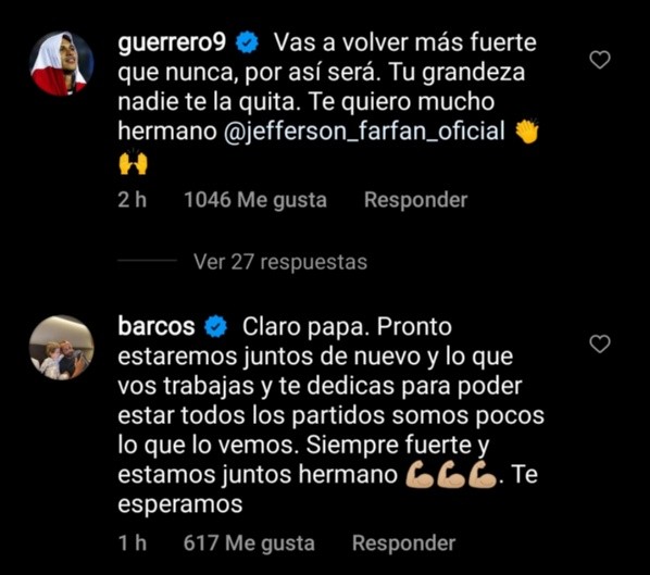 Llegaron tras ello, los mensajes por las redes sociales. Paolo Guerrero le escribió que lo quería mucho. El propio Hernán Barcos también le comentó con buena vibra.