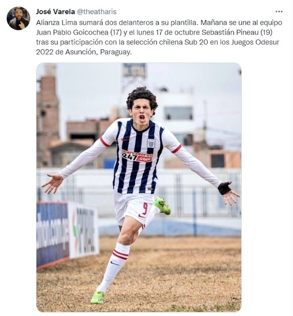 Siendo los juveniles de Alianza Lima Juan Pablo Goicochea de 17 años y Sebastián Pineau de 19, los dos jugadores tuvieron este miércoles 12 de octubre minutos de entrenamiento con el primer equipo. Habiendo sido revelada la información por el periodista José Varela, la noticia se materializó esta mañana.