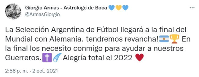 Lo cuenta de esta manera el popular medio de comunicación, quien contextualiza el poderío asertivo de este incógnito personaje: “Asimismo, previamente había dicho en junio de este año que los ‘grones’ iban a obtener el título nacional en 2022, en un momento que el conjunto íntimo venía de ser eliminado en la Copa Libertadores con derrota aplastante por 8-1 ante River Plate. Además, también predijo otros títulos como la coronación de Boca Juniors en la Liga Argentina 2022”.
