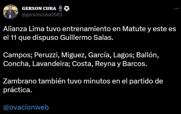 El periodista de Radio Ovación, Gerson Cuba, adelantó detalladamente el plano informativo: “Alianza Lima tuvo entrenamiento en Matute y este es el 11 que dispuso Guillermo Salas. Campos; Peruzzi, Miguez, García, Lagos; Ballón, Concha, Lavandeira; Costa, Reyna y Barcos. Zambrano también tuvo minutos en el partido de práctica”.