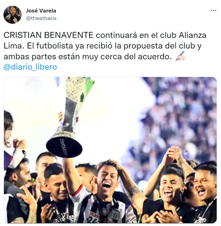 “Cristian Benaventecontinuará en el club Alianza Lima. El futbolista ya recibió la propuesta del club y ambas partes están muy cerca del acuerdo”, publicó el comunicador en su cuenta oficial de Twitter.