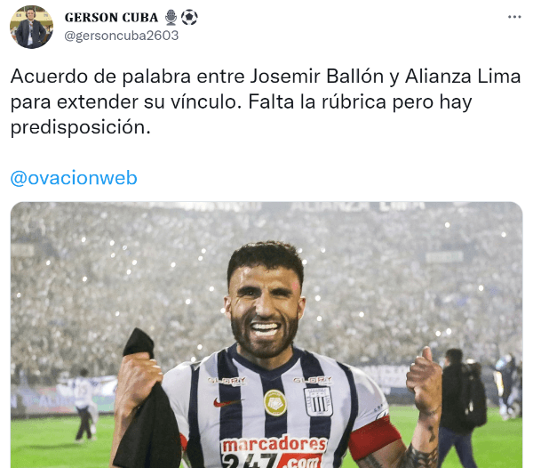 “Hay un acuerdo de palabra entre Josemir Ballón y Alianza Lima para extender su vínculo. Falta la rúbrica pero hay predisposición”,fue la información que publicó el periodista a través de su cuenta de Twitter.