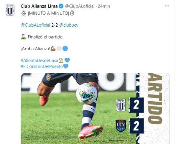 En el partido más complicado de Alianza Lima desde su vuelta a la Liga 1, el equipo íntimo empató 2-2 ante César Vallejo por la quinta fecha de la Liga 1. El partido se disputó en el estadio Iván Elías de Villa el Salvador.