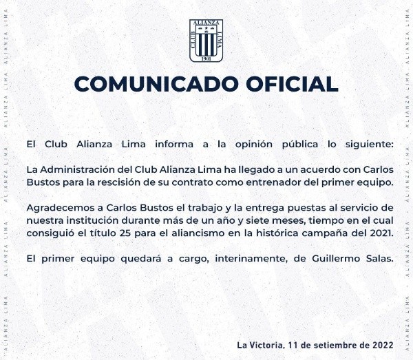 Agradeciendo su tiempo brindado en Alianza Lima, el club se despidió del estratega con un escueto comunicado. Indicando también que Guillermo ‘Chicho’ Salas será estratega de manera interina, la noticia se veía venir desde hace un par de días.