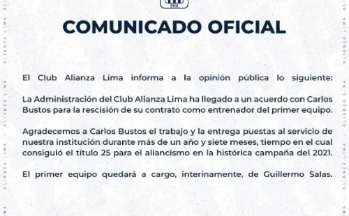 “Agradecemos a Carlos Bustos el trabajo y la entrega puestas al servicio de nuestra institución durante más de un año y siete meses, tiempo en el cual consiguió el título 25 para el aliancismo en la histórica campaña del 2021“, publicó las redes sociales de Alianza Lima.