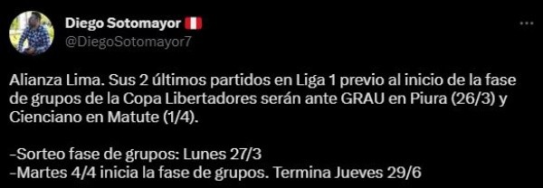 El periodista deportivo del Diario Líbero, Diego Sotomayor, contó lo que pasará con Alianza Lima en las siguientes semanas: “Alianza Lima. Sus 2 últimos partidos en Liga 1 previo al inicio de la fase de grupos de la Copa Libertadores serán ante GRAU en Piura (26/3) y Cienciano en Matute (1/4)”.