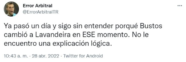 Luego del cambio que realizó Carlos Bustos, a los 79 minutos, vino el gol de Fortaleza para poner el partido 2-1, marcador con el que terminaría el compromiso dándole los tres puntos a los locales. Tras lo sucedido el periodista Horacio Zimmerman se pronunció en su cuenta de Twitter poniendo: “Moraleja: Nunca saques a quien había una asistencia e hizo un gol”, sostuvo el conductor de Movistar Deportes con una imagen en el momento preciso en el que el mismo Pablo Lavandeira se hace la misma pregunta que todos.
