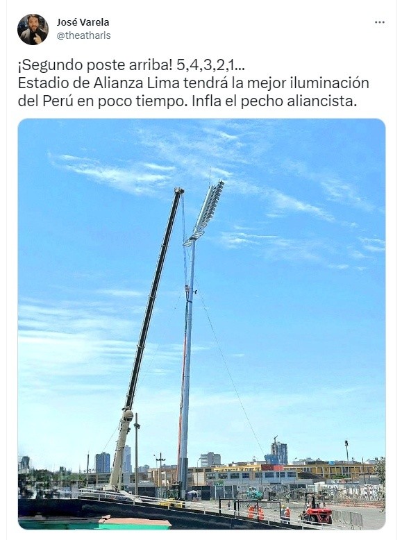En ese sentido, el periodista José Varela informó a través de su cuenta de Twitter que el segundo poste ya está colocado. Con ello, la iluminación que tendrá el estadio Alejandro Villanueva podría inaugurarse en el cotejo ante Sport Boys, a jugarse este domingo desde las 4:00 PM.