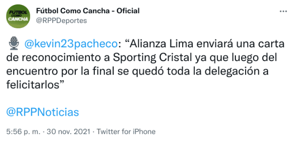 Esto hizo que los Íntimos les hagan un gesto. “Alianza Lima enviará una carta de reconocimiento a Sporting Cristal ya que luego del encuentro por la final se quedó toda la delegación a felicitarlos”, contó Kevin Pacheco de RPP en Fútbol como Cancha ¡Ese es el espíritu deportivo!