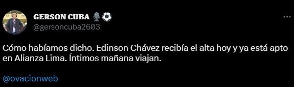 “Cómo habíamos dicho. Edinson Chávez recibía el alta hoy y ya está apto en Alianza Lima. Íntimos mañana viajan”, sostuvo para notificar a todos sus seguidores. Con esto podríamos ver una variante para el duelo del jueves por CONMEBOL Libertadores. Donde Alianza Lima querrá hacer historia por la banda derecha, con Edison Chávez a disposición absoluta.