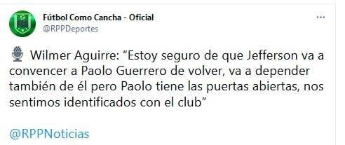 De paso, confía también en la vuelta de otro elemento importante: “Estoy seguro de que Jefferson va a convencer a Paolo Guerrero de volver, va a depender también de él pero Paolo tiene las puertas abiertas, nos sentimos identificados con el club”.